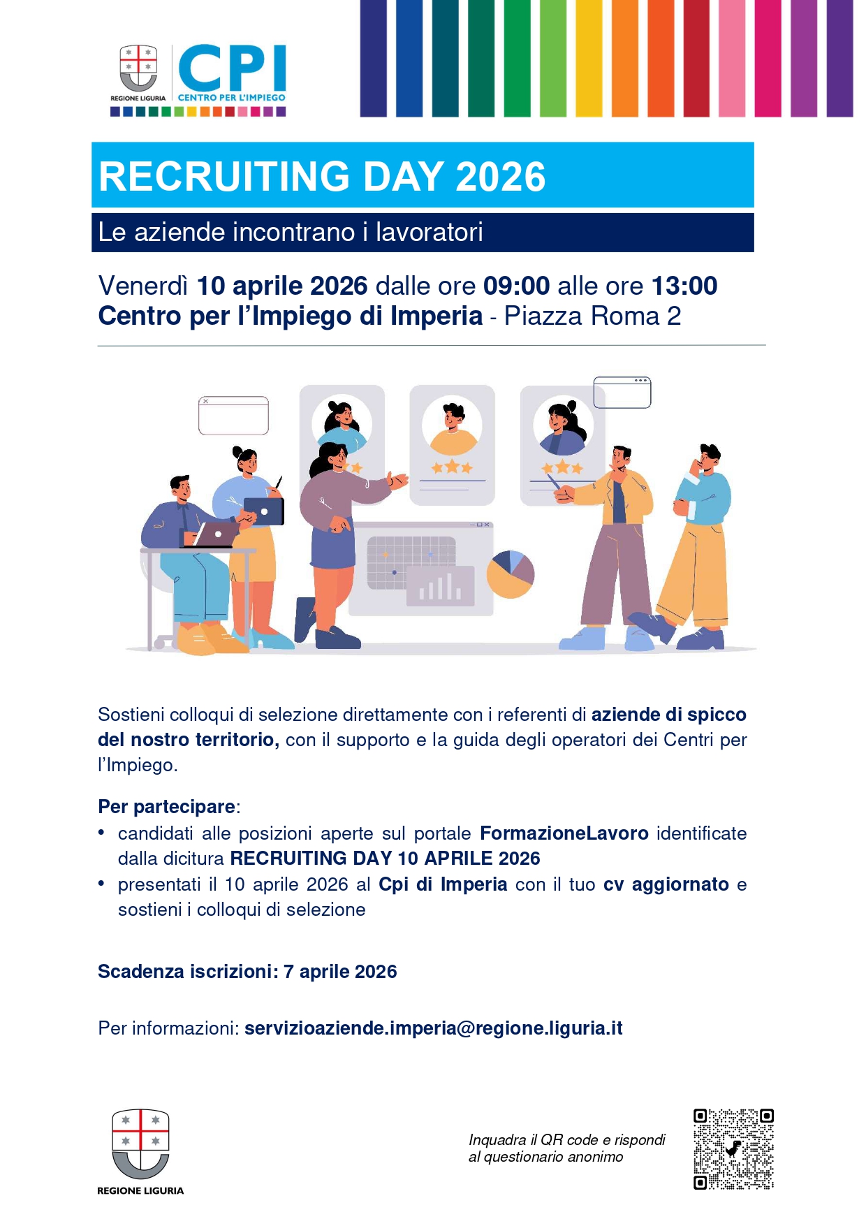 - PRESENTARSI venerdì 10 aprile con il cv aggiornato al CPI di Imperia, in Piazza Roma 2, dalle 09:00 alle 13:00.